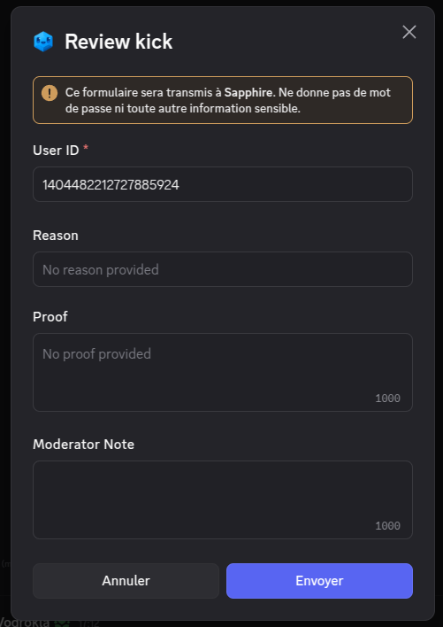 - Reason : Comme pour discord, indiquez la raison du kick en quelques mots