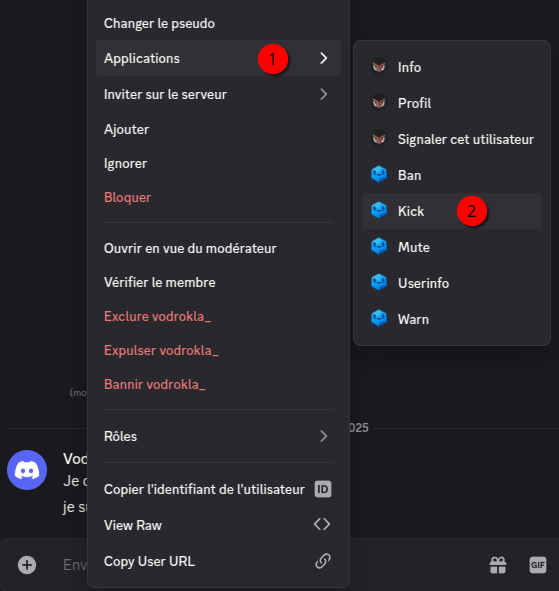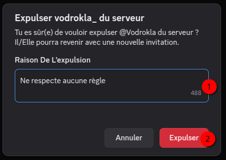 Un kick, ou expulsion en français, a une fonction assez explicite : cette action permet de faire sortir la personne du serveur, sans pour autant lui interdire de revenir.
