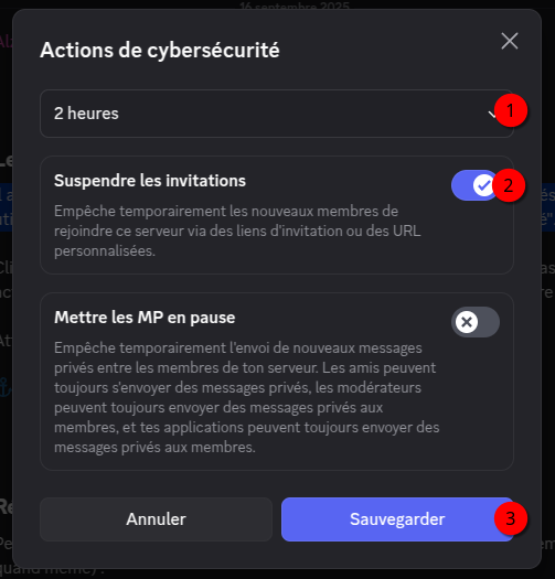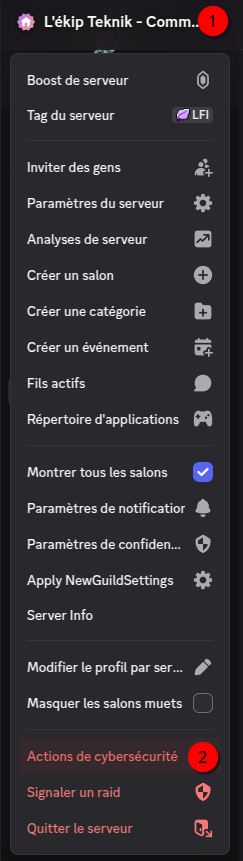 Il arrivera parfois qu'un raid soit conséquent et ingérable. Dans ce cas, n'hésitez pas à utiliser la fonctionalitée intégrée de discord : les "actions de cybersécurité".