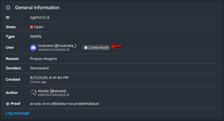 Vous pourrez ensuite voir l'existence de notes chez un·e utilisateur·ice lorsque vous faites la commande /caselist.